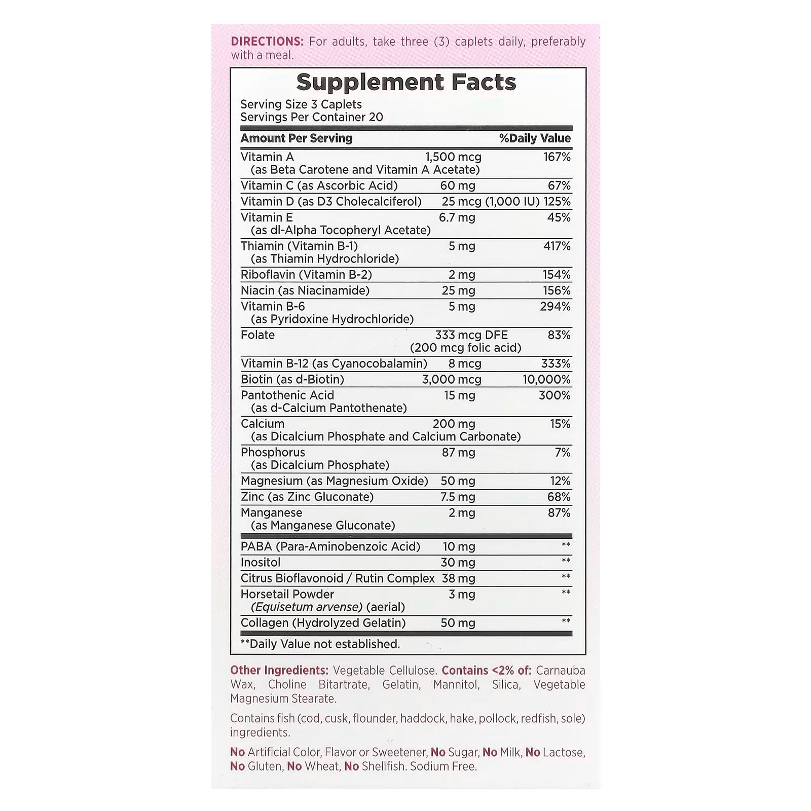 THIS INNOVATIVE FORMULA PROVIDES YOU WITH THE VITAL NUTRIENTS YOUR BODY NEEDS TO SUPPORT YOUR NATURAL BEAUTY FROM WITHIN. VITAMIN B HELPS WITH ENERGY METABLOISM, AND BIOTIN HELPS TO MAINTAIN HEALTHY HAIR AND SUPPORT HEALTHY NAILS. VITAMIN E AND VITAMIN C IS INVOLVED IN COLLAGEN PRODUCTION AND FORMATION, WHICH FORMS THE BASIS FOR VIBRANT SKIN. VITAMIN A ASSIST WITH SKIN MAINTENANCE, AND OVERALL HEALTH.